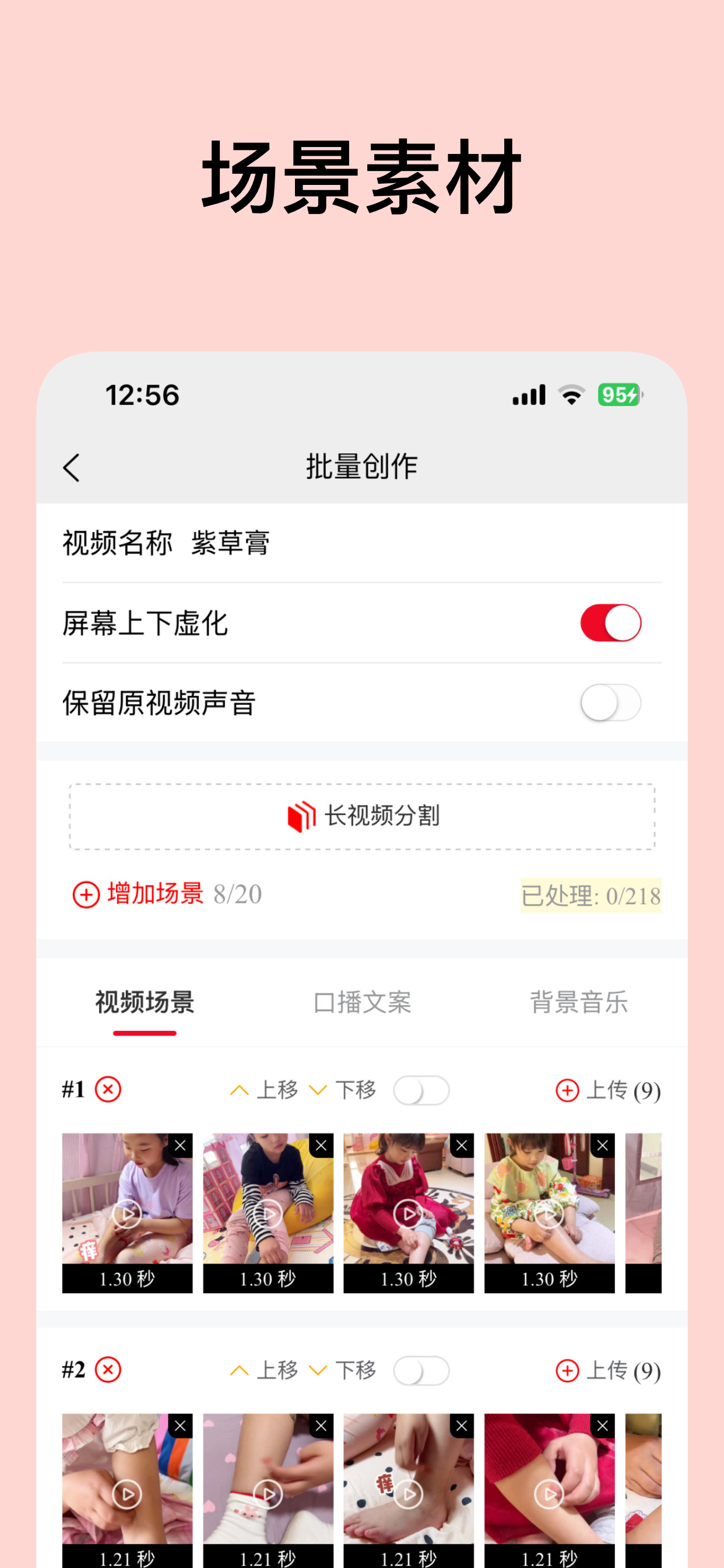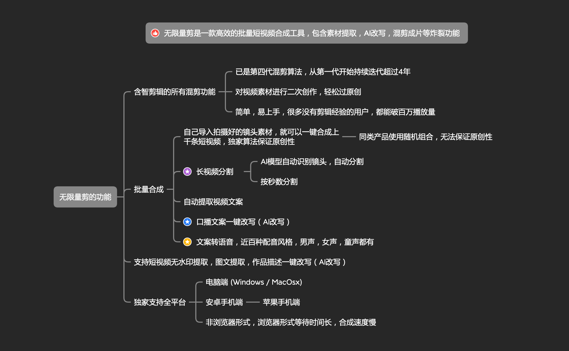 无限量剪 无限量剪是一款高效的批量短视频合成工具,导入自己拍摄的镜头素材,一键可生成上千条视频。软件独家批量合成算法,保证原创度。 软件还包含素材提取,文案提取,长视频自动分割,各种文案AI自动改写,混剪成片等炸裂功能。